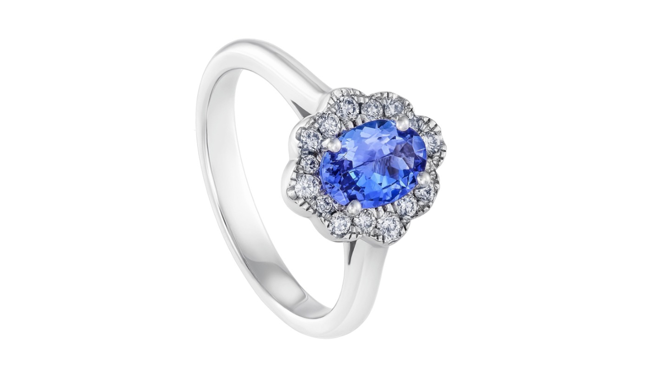 Your sweetheart’s eyes will surely sparkle when receiving this white gold ring of alluring Tanzanite gemstone adorned with delicate diamonds. These adornments will set her apart from the crowd, and put you at the number one spot in her heart. Pair it with a necklace with a mesmerising oval cut crowned by a halo of diamonds and matching stud earrings.