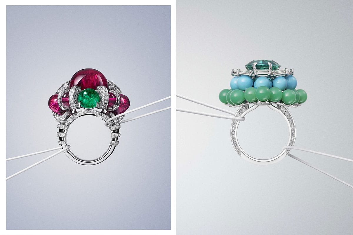 Each year, high jewellery enthusiasts look forward to the maison’s high jewellery collection; this year, it celebrates the concept of lagom, a Swedish word that signifies ‘not too much, not too little’, and promotes balance in all aspects of life. Each of the five rings in the collection is a showstopper of its own—singular rings that combine precise volumes and a symphony of colours, purity, and clean design. This includes the Bullio Ring, which utilises Cartier’s signature green-red-black combination centred around a 25.54 carat rubellite and surrounded by rubellite beads and emerald cabochons. Meanwhile, the Motu Ring comprises successive levels: portrait diamonds sparkle around the centre stone, surrounded by rows of turquoise and chrysoprase beads. Other rings include the Tateya, Skudo, and Azulejo.