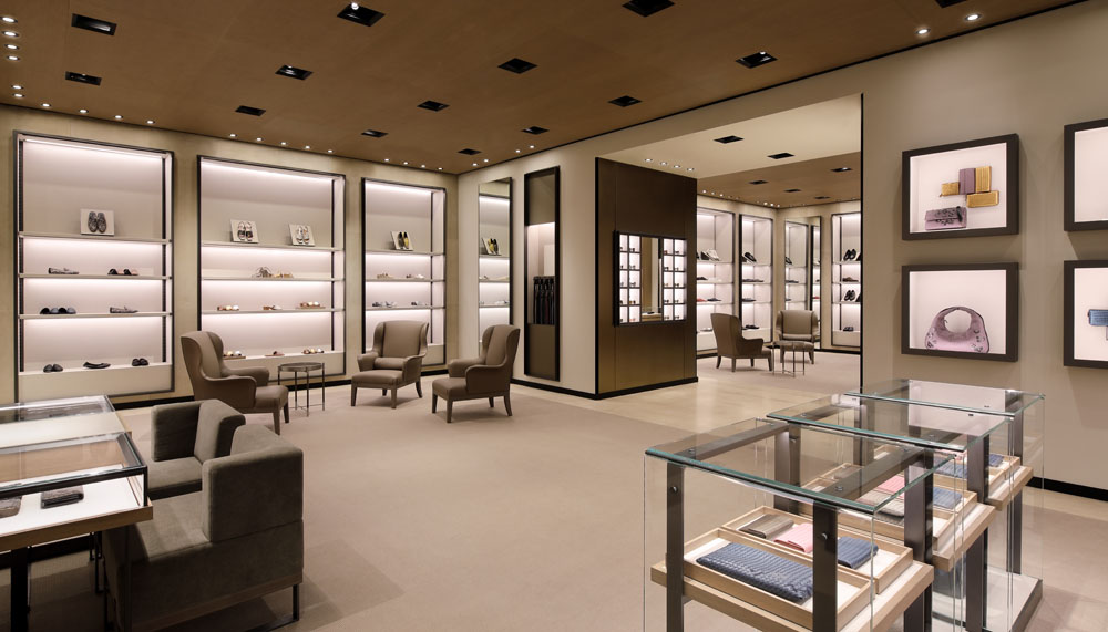 On display are handcrafted leather goods which have earned Bottega Veneta its renown, including luggage, handbags and shoes for both men and women, all with the signature intrecciato weave pattern. Other offerings include jewellery, fragrances and eyewear. An in-store customisation service allows buyers to have their initials stamped on their purchases.