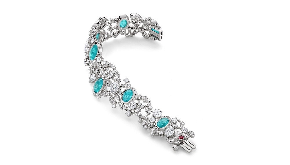 On the white gold bracelet, one finds 17.51 carats of luminous blue and green Paraiba tourmalines, the result of 470 hours of work by expert goldsmiths, gemstone setters and polishers. Look closely, and you’ll be drawn in by the lively patterns and structures found within these precious Paraiba tourmalines – jewels as radiant and enigmatic as the ocean itself.