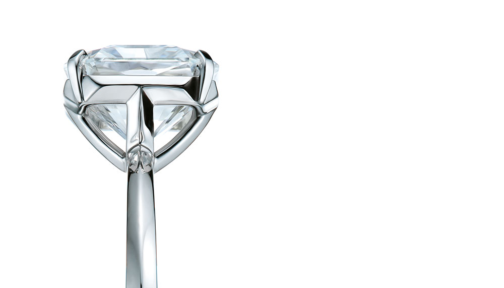 Featuring white and yellow diamonds, Tiffany True stones are brilliant-cut at the base to reflect light, while the crown has parallel facets to diffuse that brilliance. This new fancy-cut diamond exposes more surface area for heightened contrast, favouring beauty over weight.
