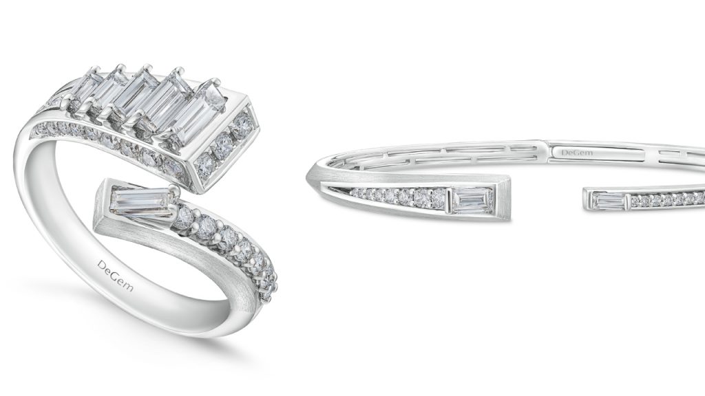 With the 15-piece DeGem Respirer, Choong and the team of DeGem designers and craftsmen focussed the creations around the use of gold to enable contrasting displays of materials, with various finishes, including fine satin, to portray depth and solidity. This was intended to encourage clients to also experiment with mixing and stacking of precious materials, such as rose, white and yellow gold (Choong recommends a bangle and a ring for daily wear, and then adding to the ensemble for dressier evenings). Adorning these designs is the unmistakable brilliance of diamonds featuring price-upon-request marquise-cut diamond earrings, a pure line of baguette diamonds on a bangle with matching ring, and twin pear-cut diamonds on the 18k yellow gold DeGem Respirer ring.