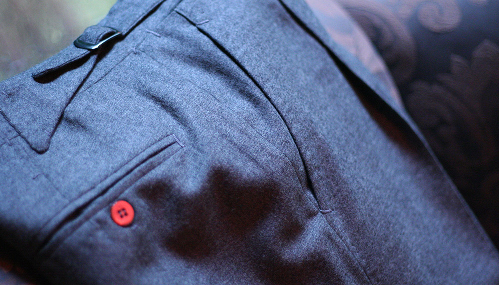 Laid flat, the product of eight hours of workmanship becomes apparent: The subtle curvature of the trouser leg, one that curved outward around the calf, then ever so gently back inward at the upper-back thigh; the meticulous stitch work of the bar tacks, the curtained waistband, and the buttoned French fly; and the cuffs, which could be unbuttoned to remove oft-overlooked dirt (the buttonholes were, in this case, not cut traditionally; rather, they were interruptions along the leg seam, and held together by two bar tacks).