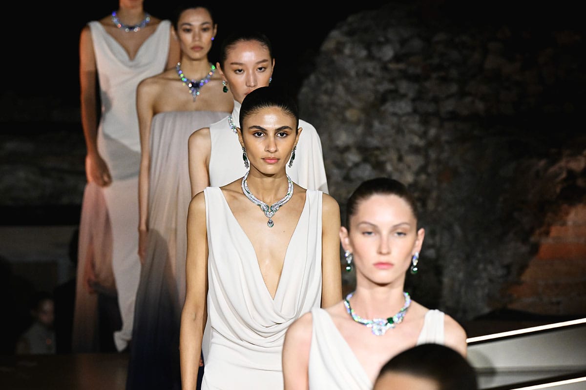The magnificent collection was introduced in a one-of-a-kind spectacle at the ancient Greek Theatre of Taormina, Sicily, showcasing 600 pieces in total, 250 of which were unveiled for the first time. Among them, 60 were deemed ‘millionaire products’, marking Bvlgari’s most extensive presentation to date. The reveal unfolded through a theatrical three-act performance inspired by Greek tragedy.