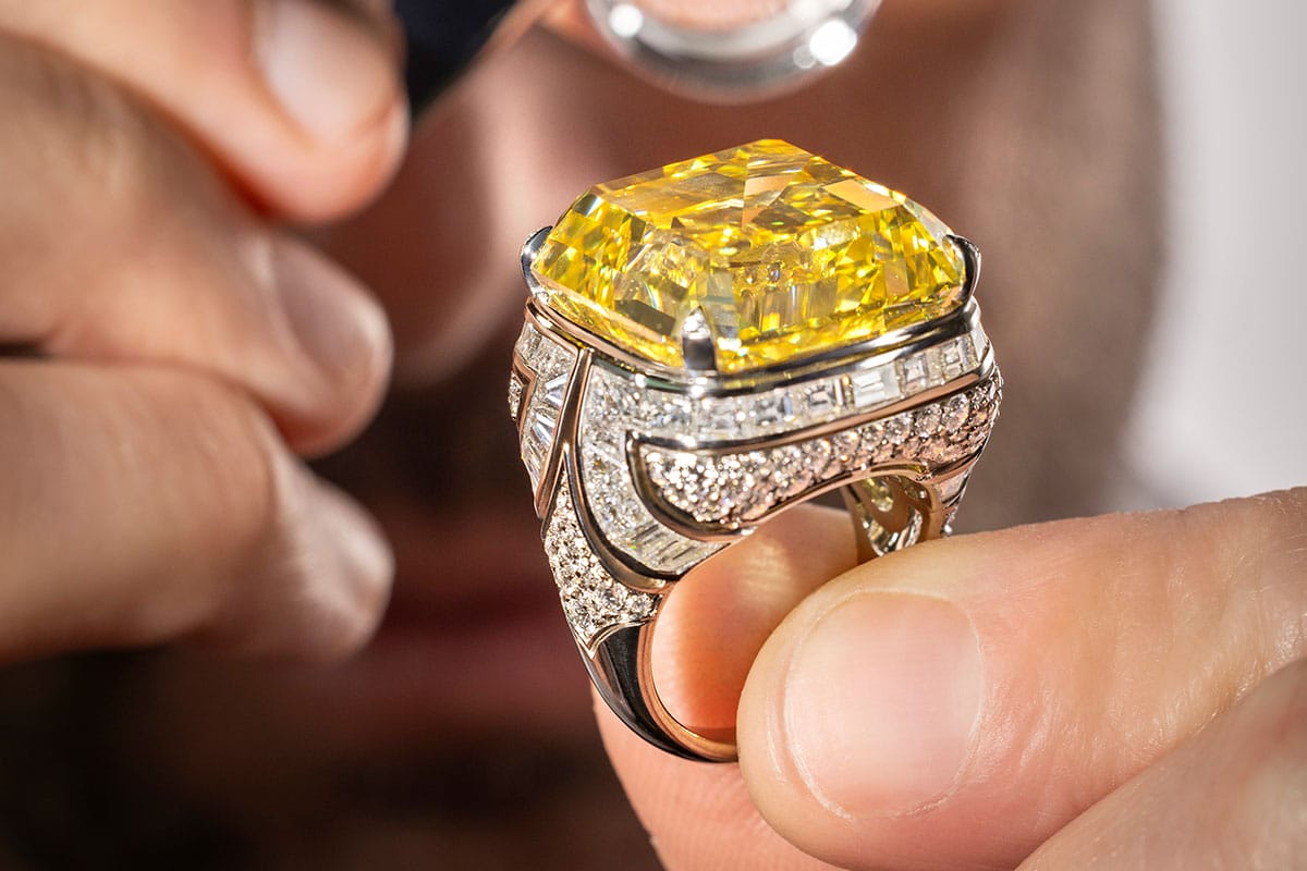 The final creation presents an architectural reinterpretation of the Trombino ring, rendered in platinum with a broad, flared band that tapers toward the base. Crowned with a 45.07-carat Asscher-cut fancy vivid yellow diamond—a rare marvel that surfaces only once every four to five years, representing just one in eight million—the Essence of Yellow ring adopts this special cut to amplify the gem’s natural intensity. Completing this piece are 42 step-cut diamonds and pavé-set stones.