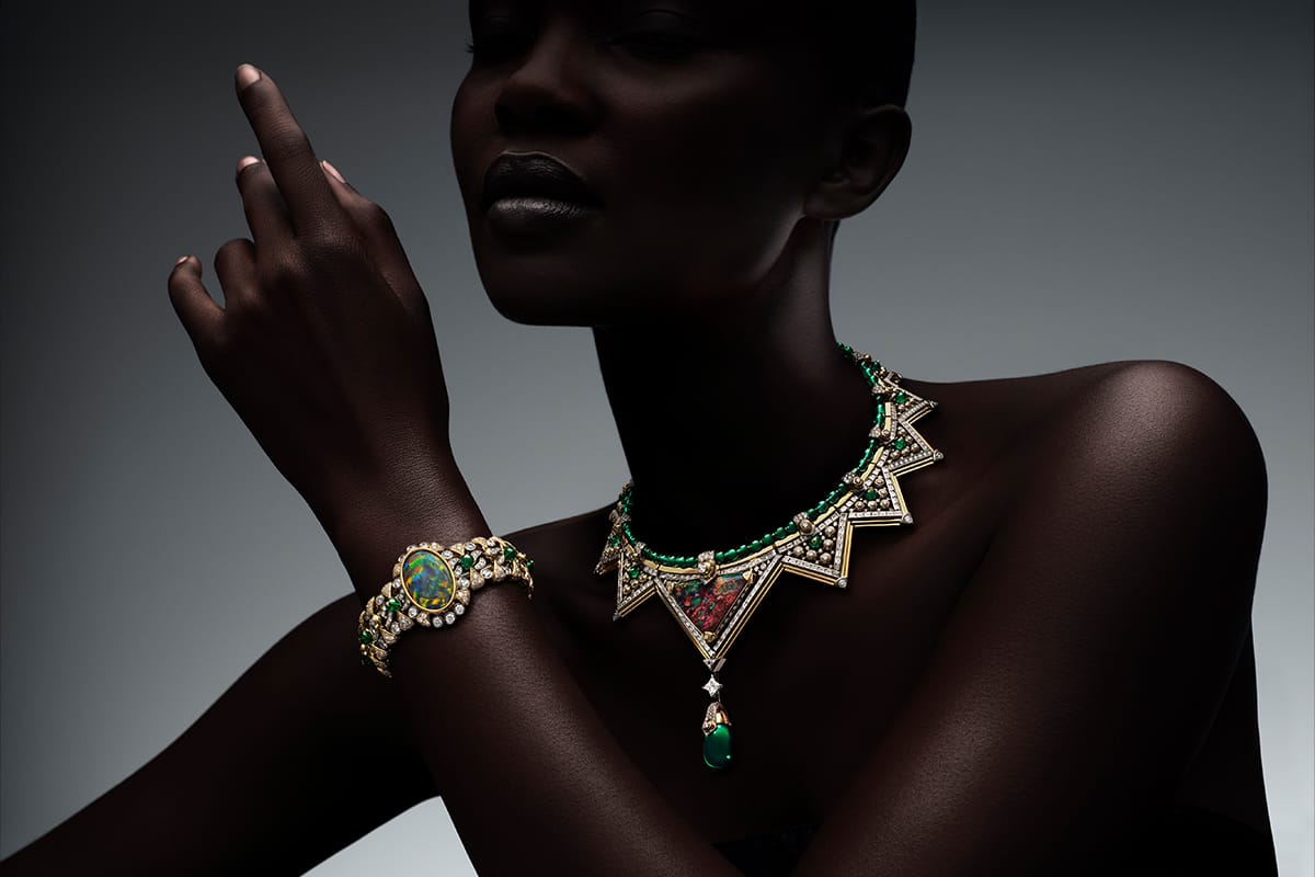 In The World of Mastery, technical skill and craftsmanship are spotlighted. This act presents seven themes, opening with Savoir—which features an entrancing necklace with a triangle-cut 30.56-carat Australian black opal that required 1,500 hours of work. The triangle is a nod to the ancient triangle of knowledge, which has also been represented in the Maison’s other designs, such as the angular corners of its iconic trunks. As captivating as an aurora, the opal flickers between hues of red and green, tracing down to an equally striking 28.01-carat emerald drop. This set is completed with a pair of earrings, a ring, and a bracelet.