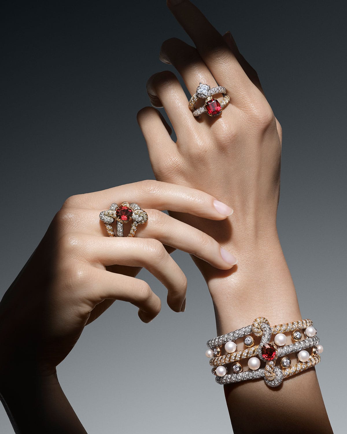 The first act of the collection rounds out with Connection, a set that opens the door to the second act, The World of Creativity. Two thousand hours of work were dedicated to creating a stunning necklace that consists of 2,000 paved diamonds, more than 100 closed-set diamonds, 114 pearls, and a magnificent red 6.04-carat pigeon-blood ruby. These gemstones are linked together by the House code rope motif, and are inspired by the hardware used on Louis Vuitton’s travel goods, acting as a symbol of transmission.