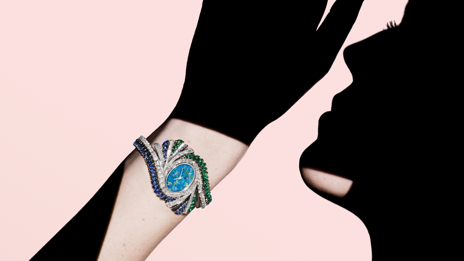 The second chapter is a symbolic nod to Piaget’s heritage, adopting a neo-Seventies theme, spotlighting undulating contours, large opal plaques, snow-set diamonds, double-tiered rings, earrings, and a timepiece. The centrepiece of this is a rose gold lasso necklace trimmed with more than 1,300 turquoise cabochons. It mimics a rope of blue gems and is accentuated by two gold chain pompoms, each finished with turquoise tips. Complementing this piece is a transformable cuff bracelet with gold and diamond fringes, concealing a turquoise watch dial.