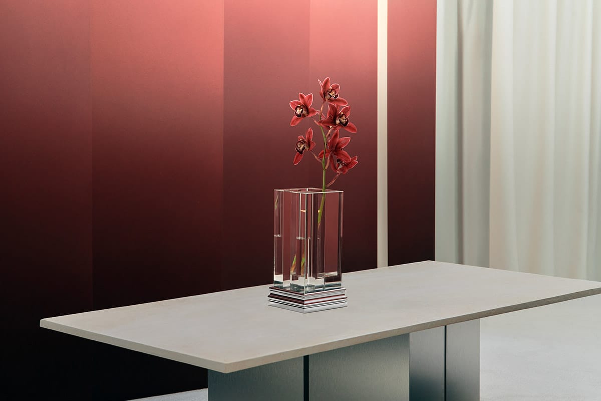 The artist, craftsman, and contemporary art connoisseur, Mathias Kiss, brings his personal touch and love for rigorously structured sculptures to the Perspectives Collection, a collaboration with luxury brand Christofle. Six distinct pieces invite various combinations and arrangements, including the candleholders, candelabras, and vase, all of which mirror the unique forms of architectural wall mouldings. They sport tastefully reshaped continuous lines, created using cutting-edge new technologies and expert craftsmanship. These include a mortise-and-tenon technique drawn from woodworking, typical of Kiss’ eclectic portfolio, as well as a classic Christofle dazzling finish, achieved through vacuum-applied PVD film. Pay particular attention to the faceted glass vase: a technical triumph constructed with 12 bespoke translucent panels, fused through UV-cured adhesive, and completed with a meticulous manual polish.