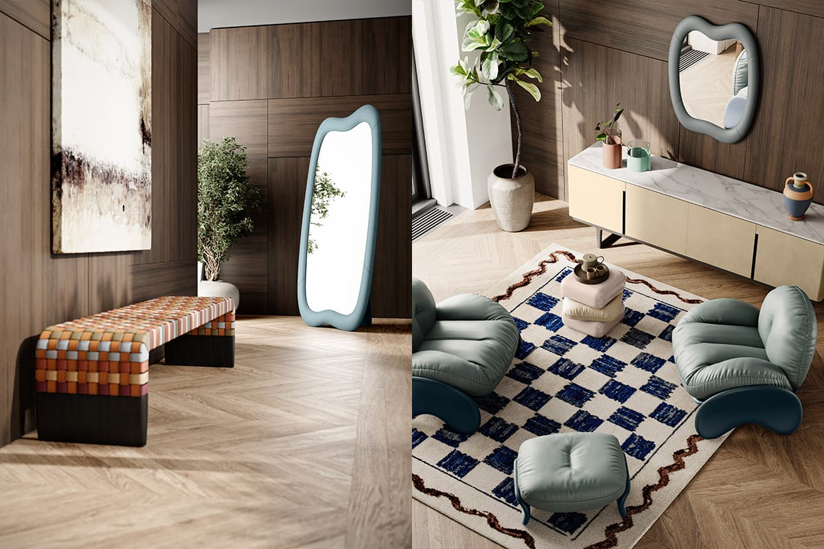 Squash, the furniture maker’s latest collection, features an armchair, ottoman, side table, as well as a mirror that comes in three sizes: a full-length frame that can be free-standing or wall-mounted; a medium mirror that is wall-mountable; and a pocket-sized compact. Each mirror is upholstered in the house’s ColorSphere leather, dressed in colours of designer Toogood’s choosing—Steel Blue, Garnet, or Chiodi Garofano. Known for her passion for form and matter, Toogood explores sculptural forms through the innovative use of materials, furthering Poltrona Frau’s reputation for fine leather craftsmanship using wrinkled textures that express the movement and malleability of the material.