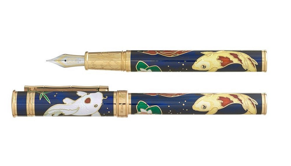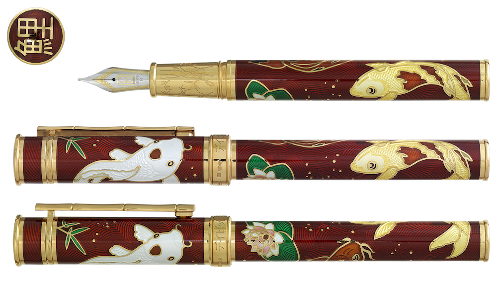 The barrel and side of the cap depict three swimming koi fish along with bubbles, a waterlily and bamboo leaves. These images are rendered in what Oscarson calls “mock” maki-e, a play on the traditional Japanese decorative technique in which designs are created by sprinkling metallic powder onto wet lacquer. The pen maker has adapted the style of these designs to his own favoured decorative method, guilloche enameling — using both high and low relief to create the depictions.