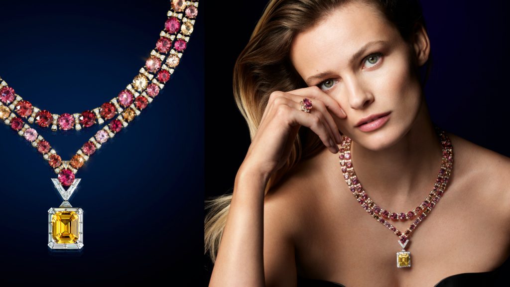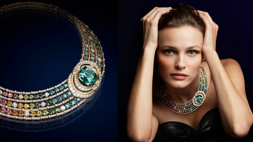 Back in 2022, its high jewellery collection Bravery collection Chapter II focuses on elements of this iconic Louis Vuitton trunk, with four different themes which hark back to elements of the trunk; Le Multipin, Le Magnétisme, Mini-Malle and Cocktail Rings. These pieces, shaped and crafted at the maison’s Parisian high jewellery workshops, showcase an assembly of savoir-faire. In the Le Multipin necklace – a bejewelled vision of the trunk’s locking mechanism – more than 100 coloured stones feature; pink and green tourmalines, yellow citrines, blue aquamarines and violet tanzanites add up to 100 hundred carats, aligned across three rows and headlined by a rare 42.42-carat lagoon blue tourmaline.