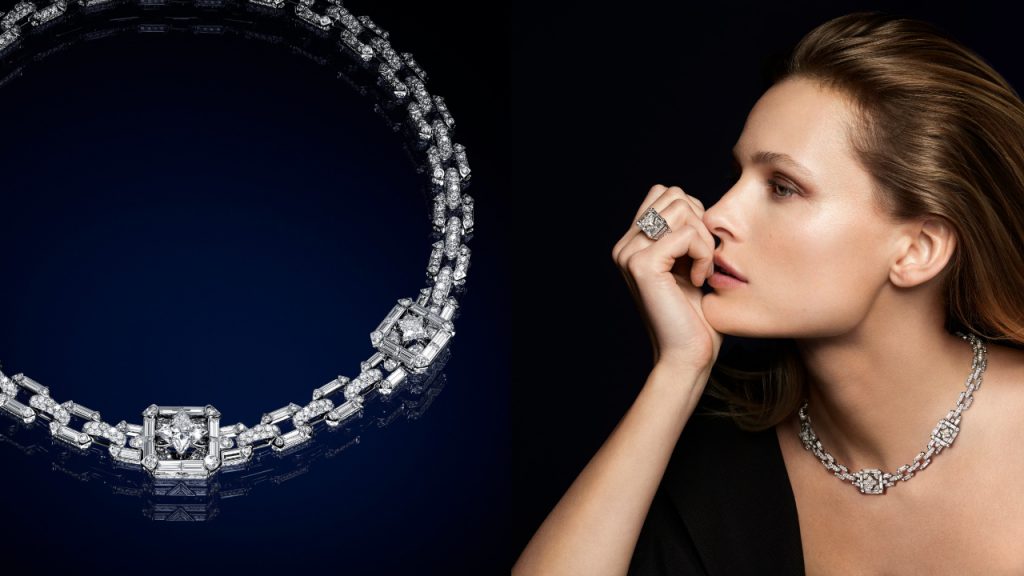 Meanwhile, the Le Magnétisme is a reinterpretation of the shape of the trunks’ metal corners, thus its rectangular silhouette framing the main 20.29-carat cushion-cut Sri Lankan yellow sapphire. The only monochrome set – La Mini Malle – combines diamonds and white gold into a series of links with Monogram flower-cut diamonds – a jewellery cousin to the Petite Malle of 2014. This necklace also transforms into a choker and two sparkling bracelets – an ephemeral innovation which M. Louis Vuitton would doubtless approved of.