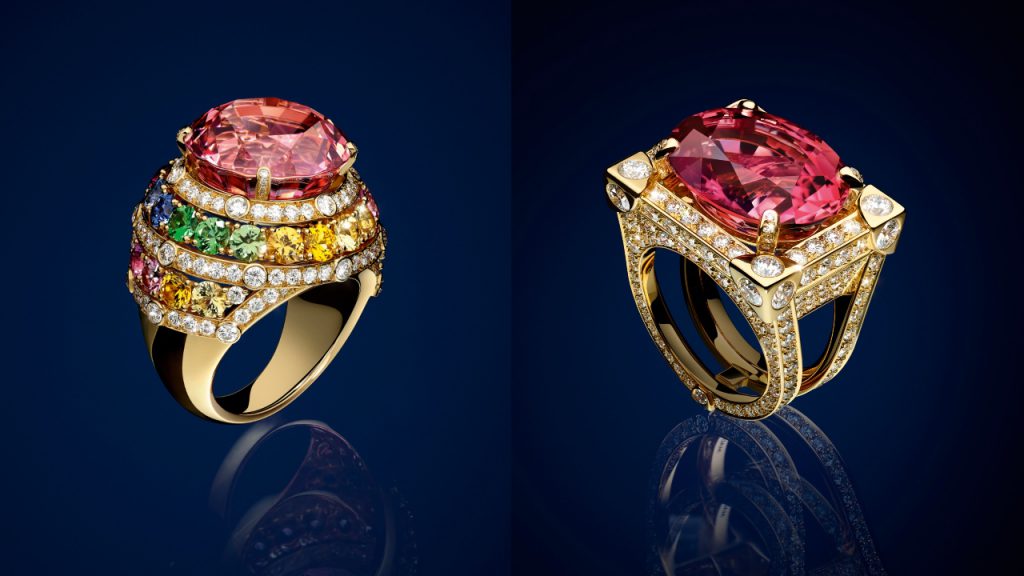 Rounding off the Bravery collection Chapter II collection is the quartet of cocktail rings offering a central brilliant-cut coloured stone which required some three years of searching. These stones are another testament to the beauty of far corners of the globe, with a pink Padparadscha and cerulean sapphire from Madagascar, ruby from Mozambique and vivid green demantoid garnet.