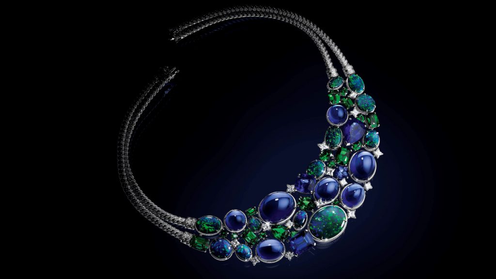 The first chapter, La Constellation d’Hercule, was named for the constellation under which Vuitton was born on 4 August 1821. As such, the bib necklace is made up of tanzanite, tsavorite and Australian opals that represent the night sky full of stars.