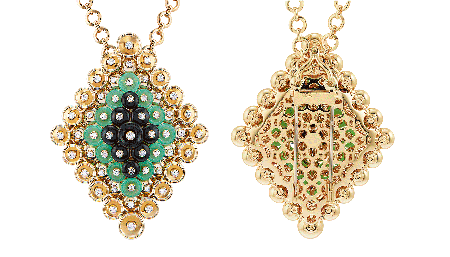 The collection is distinguished by two different sets; the carnelian stands out with a warm undertone of pink gold and mother of pearl, while the onyx and chrysoprase pastilles are contrasted by a light yellow gold.