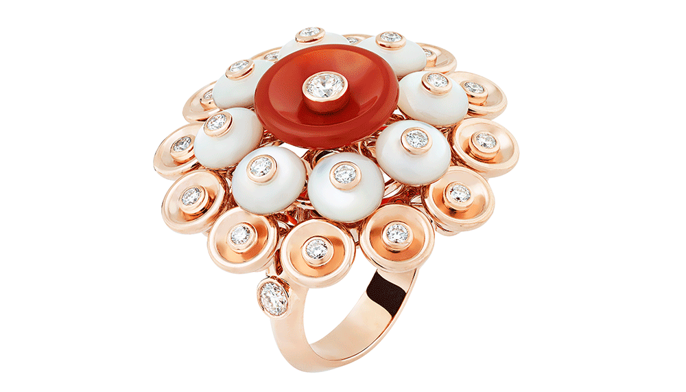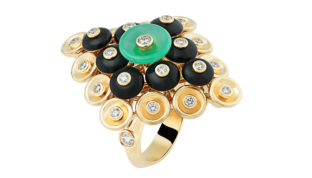 The Bouton d’Or collection’s style has its origins in the Paillette motif, which first appeared in the maison’s archives in 1939. The simple circular motif was pieced together to form rings and double bracelets and necklaces, soon finding its way to the cover of Vogue USA in April 1956.