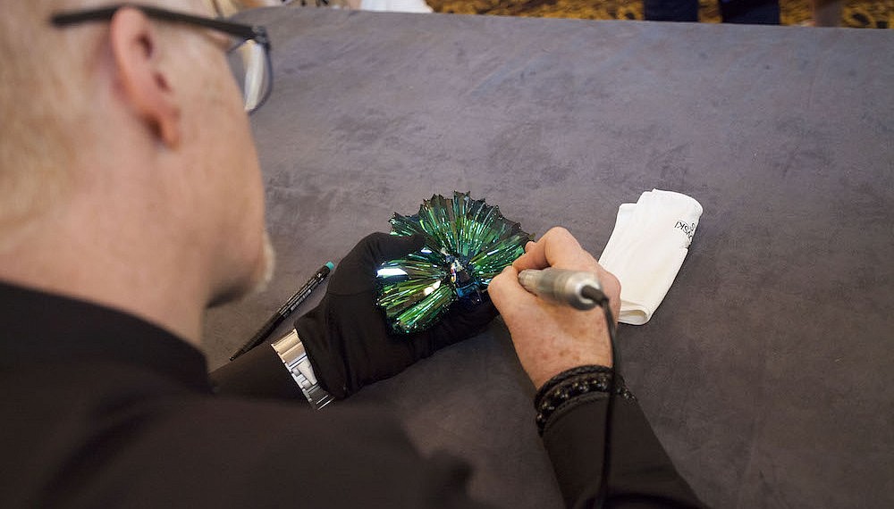 Wildlife has been the dominant theme in Swarovski’s SCS annual editions since its inception. Zendron’s first contribution was in 1993 (an elephant) during a time when clear crystal was favoured. Gradually though, more colour has been introduced, culminating in the 2015 Peacock Arya – a technically-challenging piece with an enormous green tail attached to a tiny blue body. The Bear Arcadia, while not as complex, also presented its own challenges. Unsatisfied with the colours available, Zendron worked together with Swarovski’s production department created a new colour of crystal. That isn’t as simple as just applying dye; Swarovski coloured crystals are created through applying traces of metal during the crystal-making process and the ratio has to be just right, other bubbles or other flaws creep in during crystallisation.