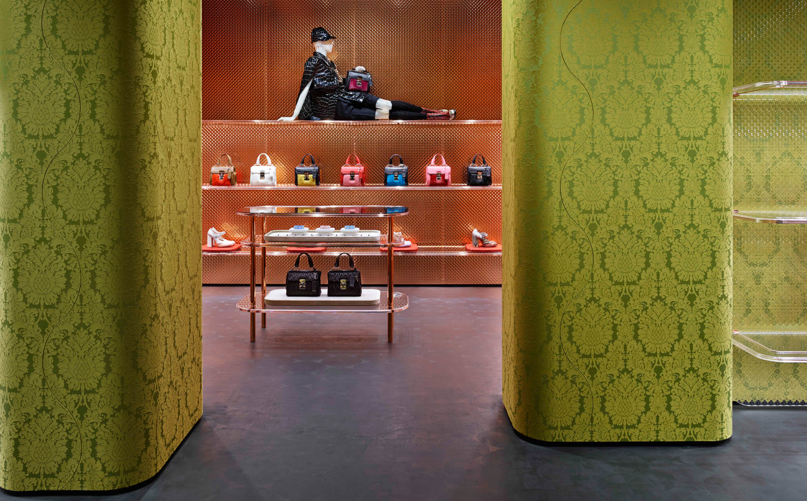 Inside, the 720sqm interior couldn’t be more different from its minimalistic exterior. The combination of reflective copper walls and rich green brocade provides a feast for the eyes, while expansive chairs encourage visitors to linger. But first, peek under the canopy to enter.