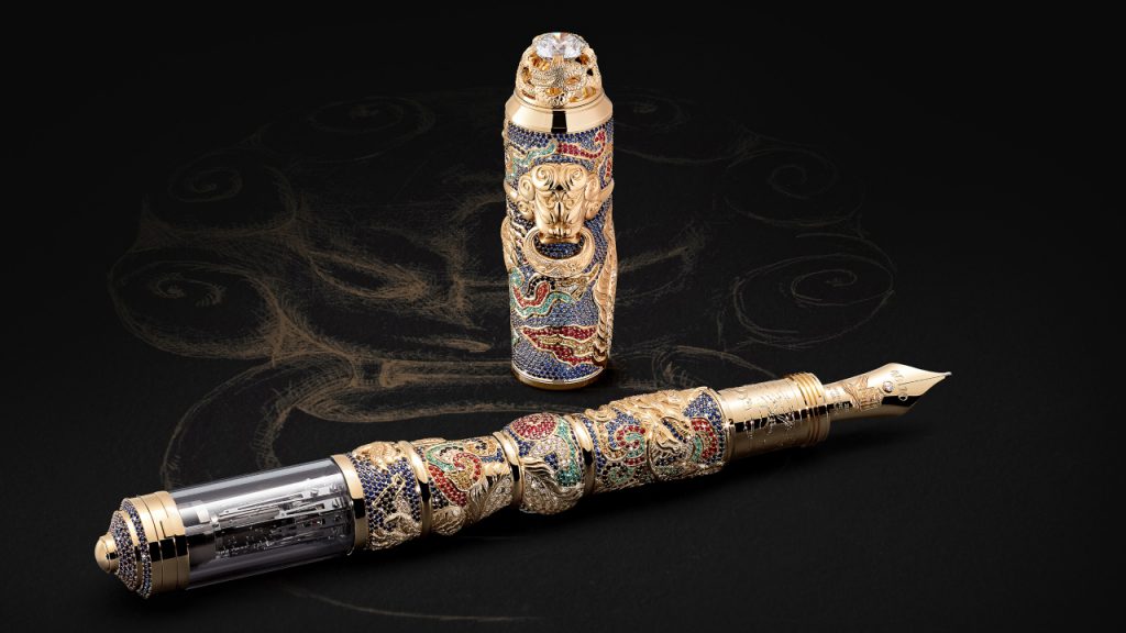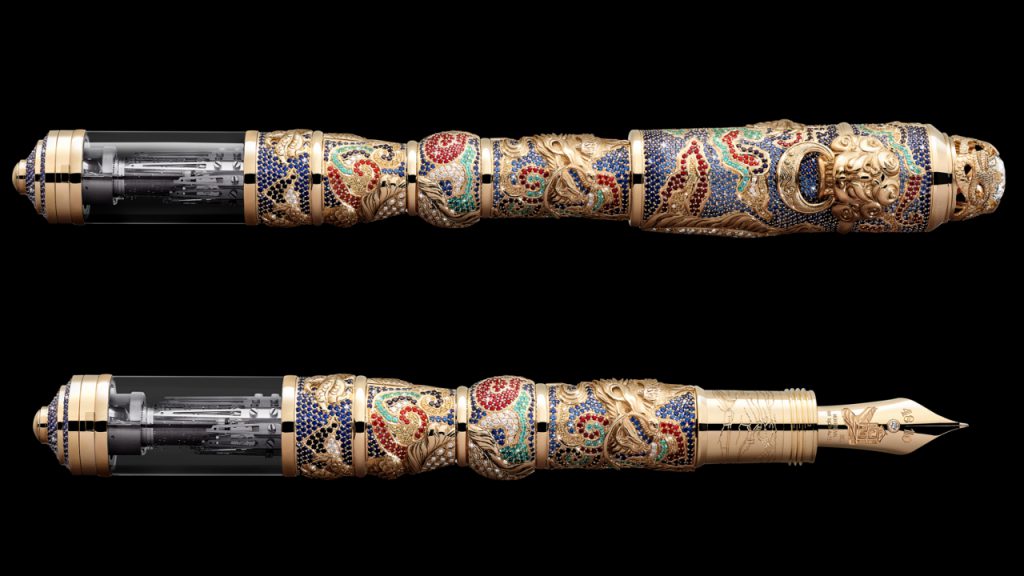 Montblanc’s writing instrument tribute to the Great Wall of China is led by the High Artistry Tribute to the Great Wall Limited Edition 1 Imperial (€1.95 million or about RM9.6 million) and yes, it is a unique piece. Its undulating silhouette plays canvas to a landscape inspired by Ming dynasty artwork, depicting a dragon snaking around the solid gold cap and barrel, winding between a rainbow of pave sapphire, rubies, tourmalines and diamonds. This is topped by a truly exceptional feature, especially for a pen: it houses a miniature music box at the top of the barrel, meant as a homage to the chime bell instruments of the royal courts of the past.