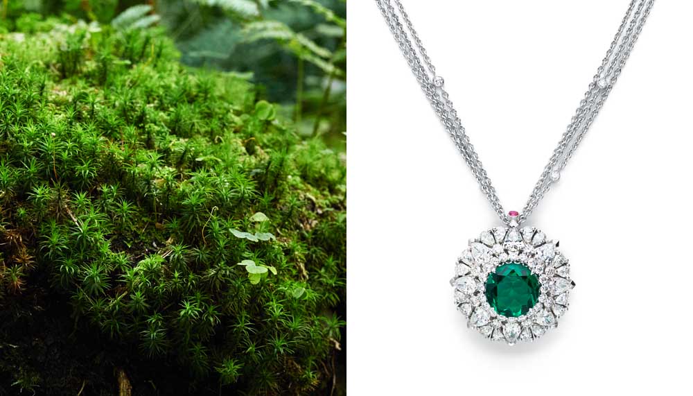 Through Gübelin’s eyes, a rare, round 2.84 carat Colombian emerald strung on a platinum necklace – an entrancing piece from their Ornament of Flowers line, under the Pioneer Collection – is the vista to a Mystical Garden, aptly framed by 24 pear-shaped diamonds and 92 brilliant-cut diamonds. Beneath its lush green surface lie inclusions that resemble the botanical forms of delicate fronds, shining petals, and tranquil forests – a wondrous realm within the heart of the stone.