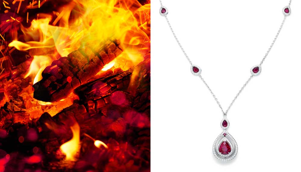 Not to be outdone, the world of Glowing Fire comes into play when rubies – or rather, their inclusions – reveal themselves. Blazing with fire and passion, a ruby might contain an oval droplet of basaltic melt that glints and dances like a live flame. Take Gübelin’s white gold, halo-like Glowing Ember collier, a striking combination of nine pear-shape rubies totalling 1.62 carats and a 2.58 pear-shaped ruby (all sourced from Myanmar), which burns brightly around its lucky wearer’s throat.