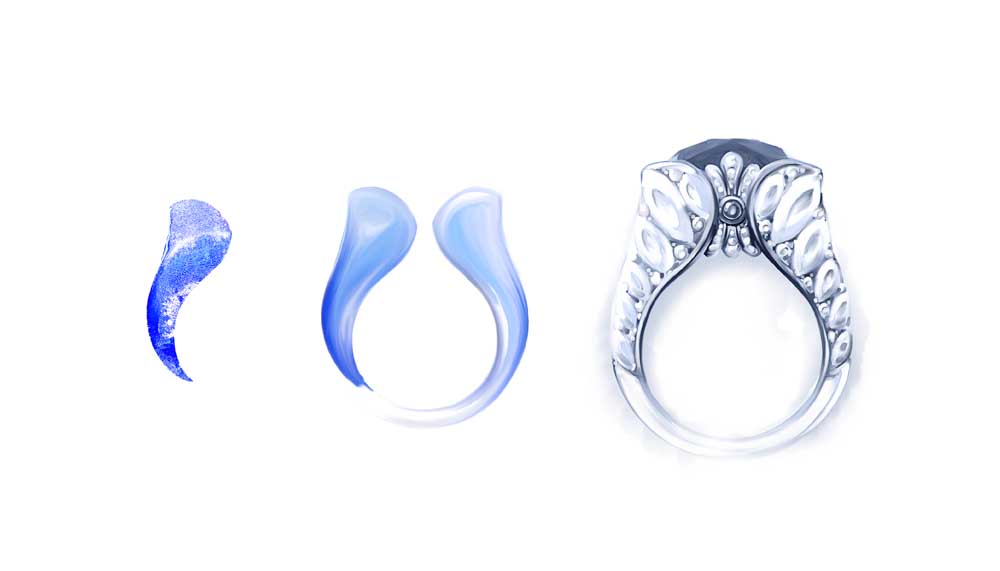 Similarly, The Story of the Seahorse sapphire ring – one of a series of masterpieces by Gübelin’s designers – alludes to a curling sapphire inclusion that resembles the shape of a seahorse. With two dramatic diamond vertebrae forming a seductively curvaceous spine for a 23.23 carat cushion-shape sapphire from Sri Lanka, the contrast between the sparkling blue, one-of-a-kind gemstone and the 32 pear-shaped diamonds that surround it make quite a sight.