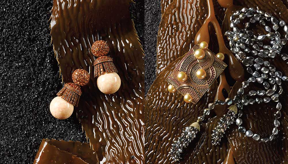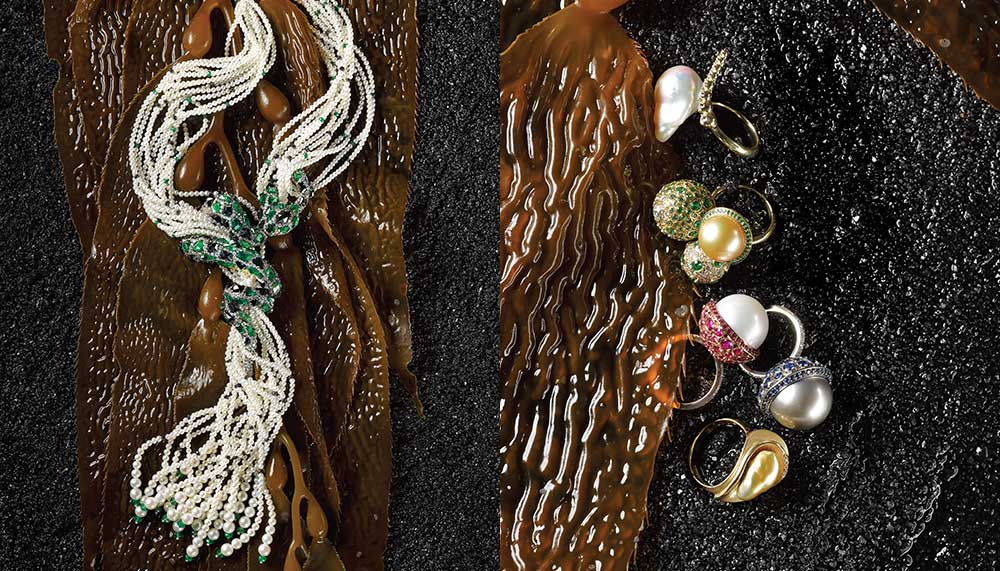 Lotus Arts de Vivre necklace with natural blister pearls, scarab-covered wooden beads, and diamond accents; Assael necklace with baroque Tahitian cultured pearls; Mikimoto ring featuring a golden South Sea cultured pearl and gemstones