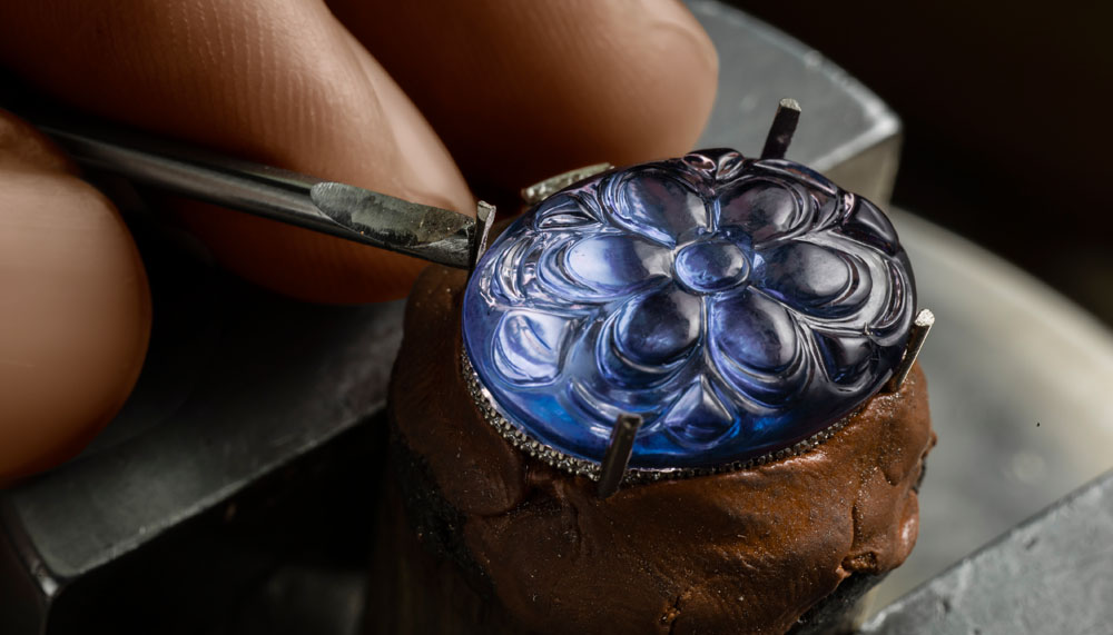 The piece that most exemplifies Piaget must be the Extremely Piaget secret cuff watch (RM890,000). Fashioned out of 18k white gold and set with 601 brilliant-cut diamonds, its capstone is a 15.65-carat hand-worked amethyst that conceals a dainty watch and the in-house 56P quartz movement within. It is here that the maison’s exquisite mastery of gem setting, engraving and watchmaking come together.
