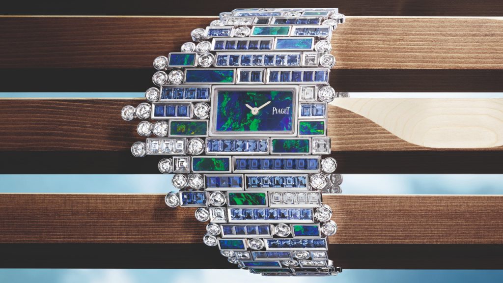 Set on an 18k white gold bracelet, it is an asymmetrical array of 151 baguette-cut sapphires, 25.67 carats in total, backed up by 171 diamonds both brilliant- and baguette-cut and totalling 15.69 carats. They are arranged with an intermittent, organic rhythm that takes after shimmering waters. At its heart is the black opal dial of the watch, which is powered by an in-house quartz movement.