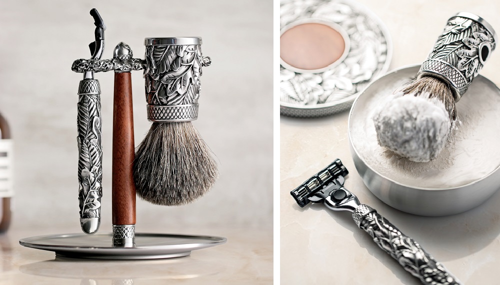The recently launched Woodland collection by Royal Selangor addresses the male dominion. In the case of the razor, the great versatility of pewter enables its men’s accessories collection to be adorned with sculpted oak and elm leaves. Other luxuriant touches include a drip tray holding a brush of genuine badger bristle, and satin finished shaving bowl.