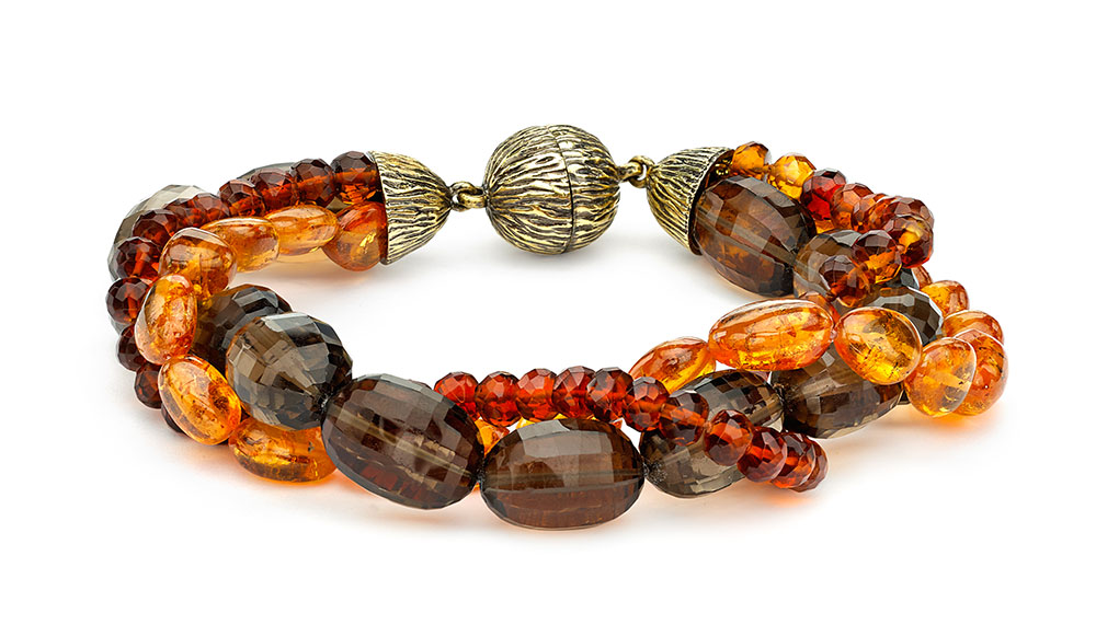 Florida-based Pamela Huizenga is an expert in utilizing unexpected stones and textures, as shown in this bracelet, which shines with beads of faceted smoky quartz, smooth spessartite, and deep red hessonite garnet.
