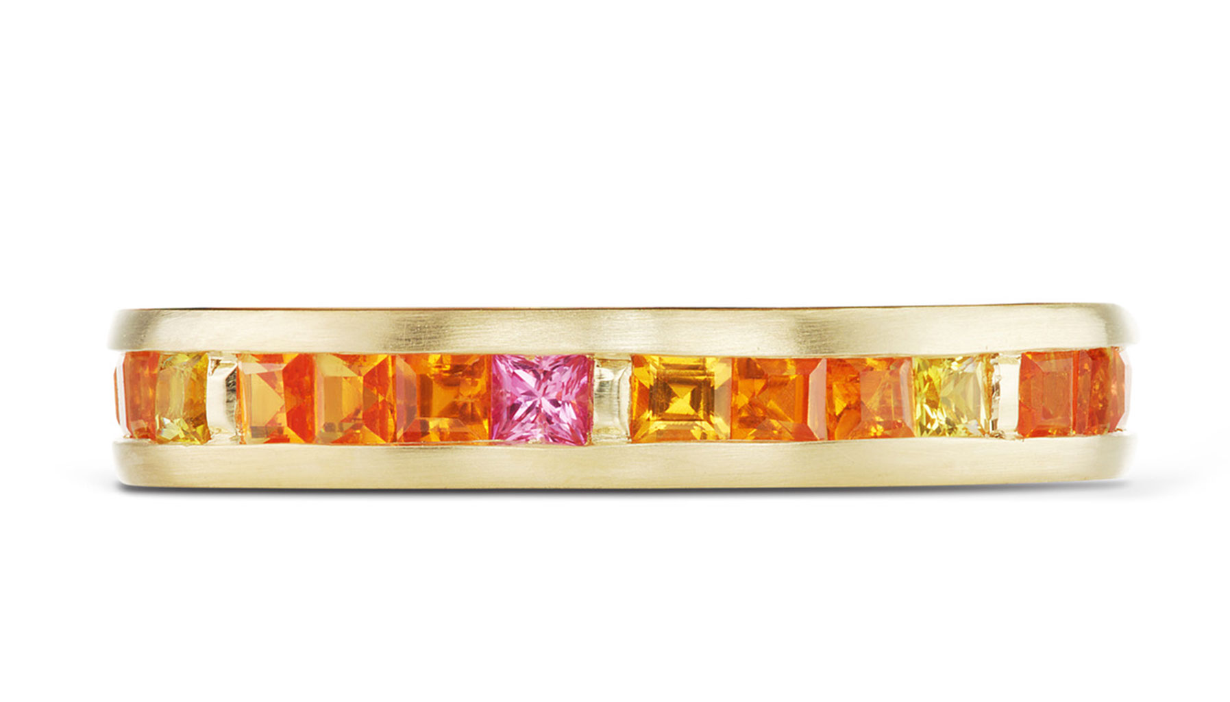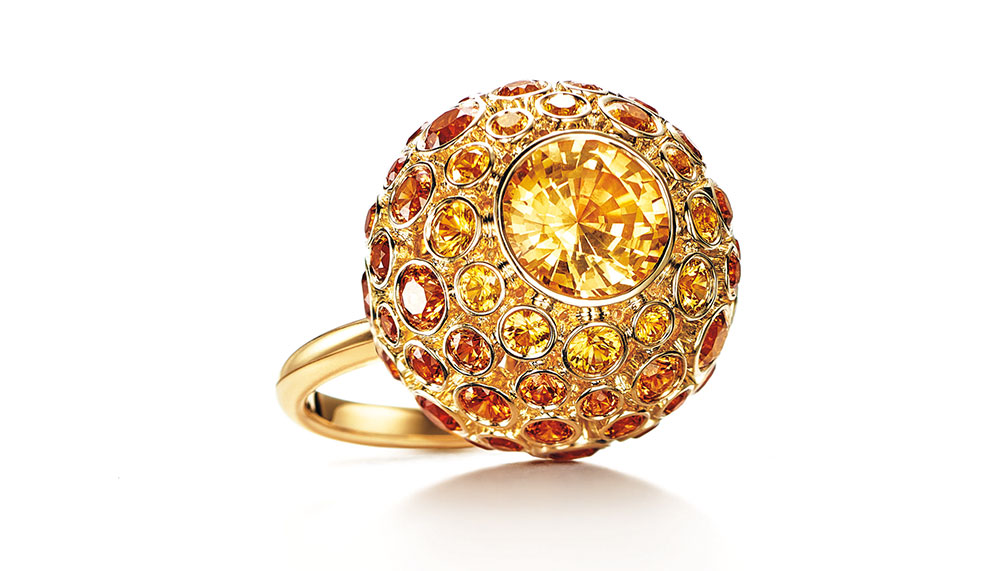 Tiffany & Co.’s interpretation of spessartite is imbued with polished playfulness. The 18-karat yellow gold statement ring from the Masterpieces Collection is covered with a honeycomb of yellow sapphires and bright orange spessartites.