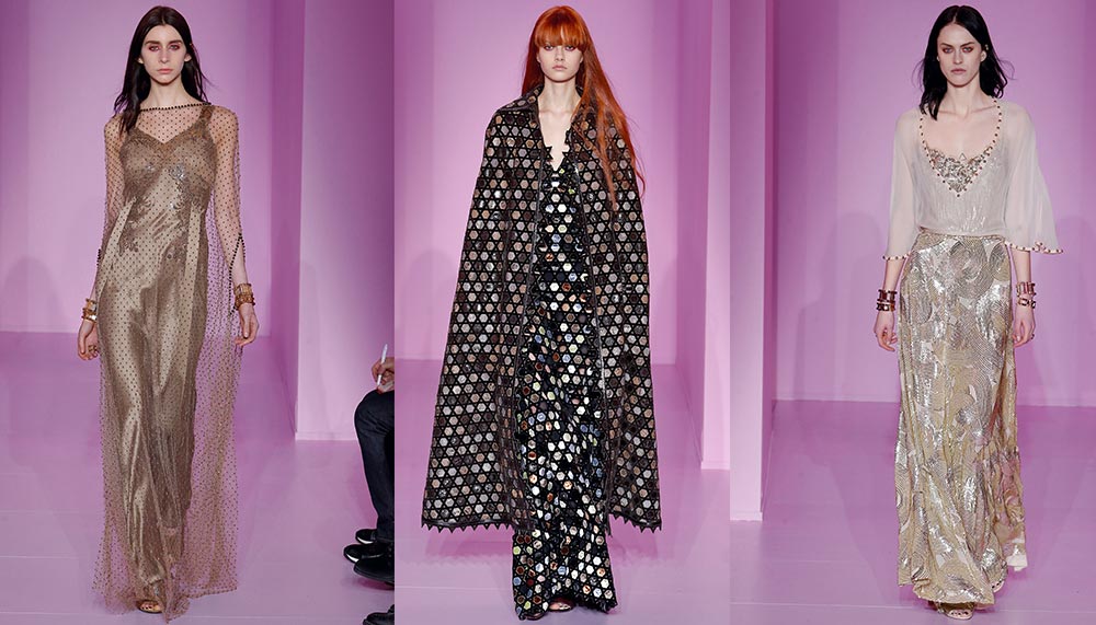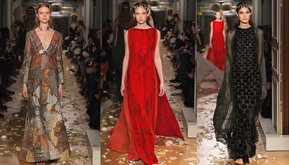 Valentino, on the other hand, drew inspiration from the late Spanish couture designer Mariano Fortuny. Working with his company, the brand recreated Delphos, Fortuny’s iconic floor-grazing dresses in Valentino’s signature hues ranging from moss green to burnt orange. Creative directors Maria Grazia Chiuri and Pierpaolo Piccioli followed up from where they left off during the Autumn/Winter 2015 haute couture collection, with a new medley of exquisite flowy gowns. Embellishment served only to enhance texture: huge butterflies embroidered at the hem of a white velvet gown, butterflies and flowers on a brocade dress of peacock green and gold, strips of velvet sewn onto a sheer tulle confection, and gold stitching on a sage tulle skirt. The most elaborate outfit from this collection took up 2,800 hours to complete.