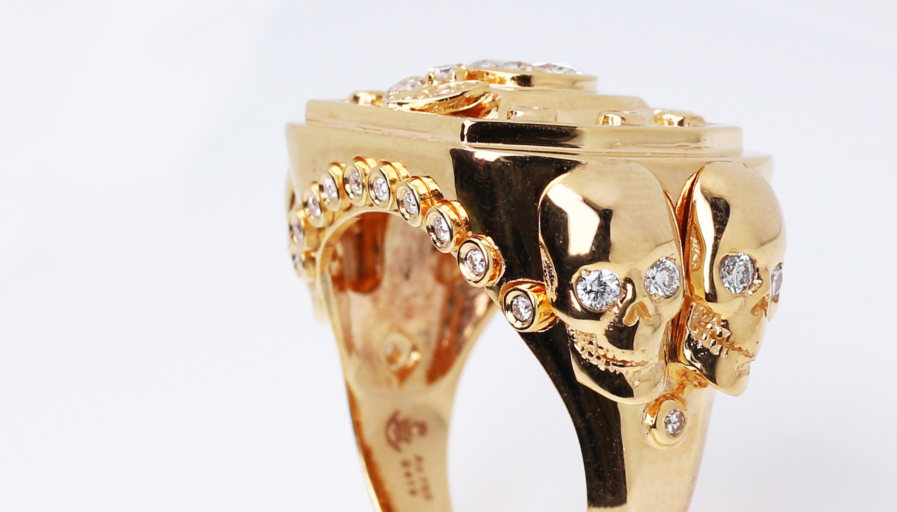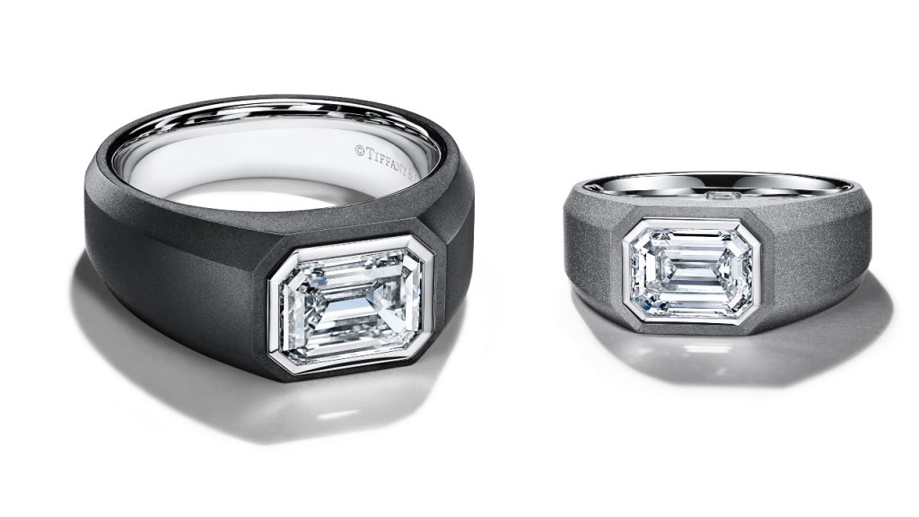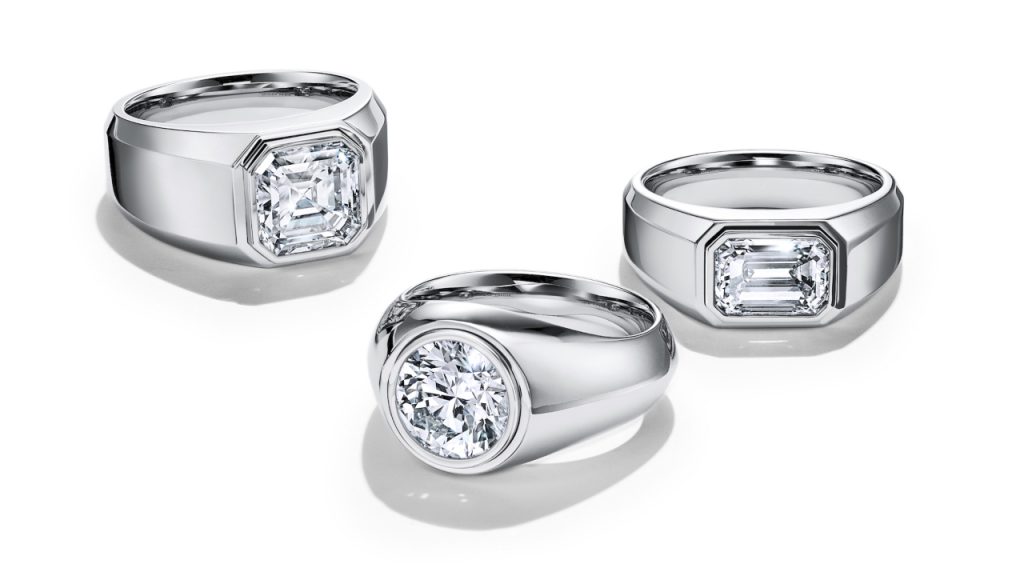 The collection is called The Charles Tiffany Setting, not because it incorporates a new setting technique, but because it is a tribute to the iconic (and widely copied) six-prong Tiffany setting created by founder Charles Lewis Tiffany. Each ring is designed to hold either a round brilliant or emerald cut diamond of up to five carats in a bezel-style setting. The round brilliant cuts are set in streamlined, knife-edge bands that the company says are inspired by the band on the ladies’ Tiffany Setting. The styles with emerald cut diamonds are designed with strong, architectural beveled edges, reflecting the tendency for men’s jewelry to have a masculine edge that sets it apart from ladies’ designs. Although, now that signet rings are growing in popularity among women, there is no reason why these men’s engagement rings couldn’t also be worn by a woman, possibly as a cocktail ring.