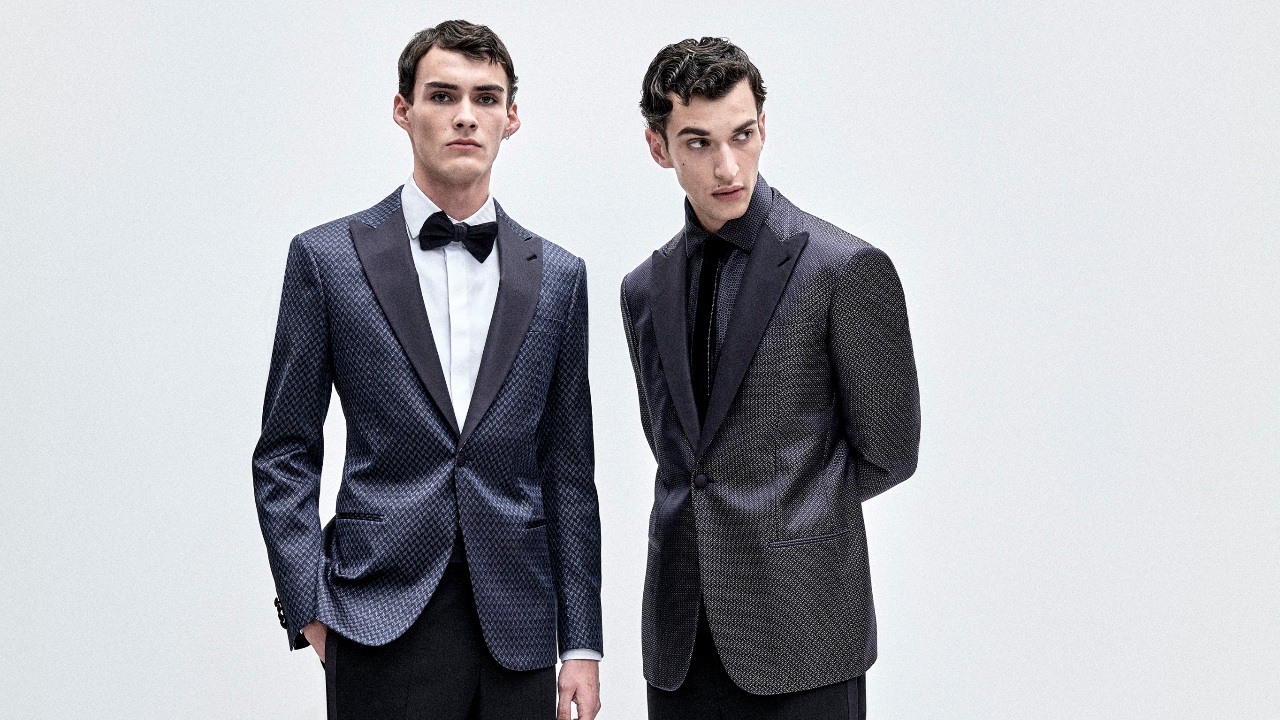 Giorgio Armani’s Autumn/Winter 2023/2024 Giorgio’s collection exudes nocturnal elegance with clean lines, intricate jacquard designs, and a play of glossy and matte textures. Crystal accents adorn dinner jackets, waistcoats and trousers, while shirts feature minimal collars paired with ties and bow ties. Its colour palette centres around black with hints of blue and ruby red, enhanced by materials such as jacquard silk, velvet and cashmere. Completing this selection are opulent cashmere coats with shawl collars.