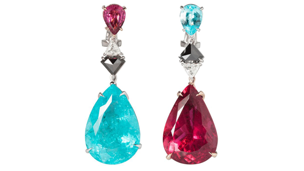 Brazilian jewellery designer Ara Vartanian honours his country’s heritage and craftsmanship, while focusing on incredible gemstones (his father was a gemstone dealer) such as Paraíba tourmalines, which are only found in his native country. He is also known for adding an edgy twist to fine jewellery by using reverse-set stones and black diamonds. These contrasting earrings feature large pear-shaped Paraíba tourmaline and rubellite, and even the metals are mismatched in 18-karat white gold and 18-karat yellow gold to highlight the colours of each stone.
