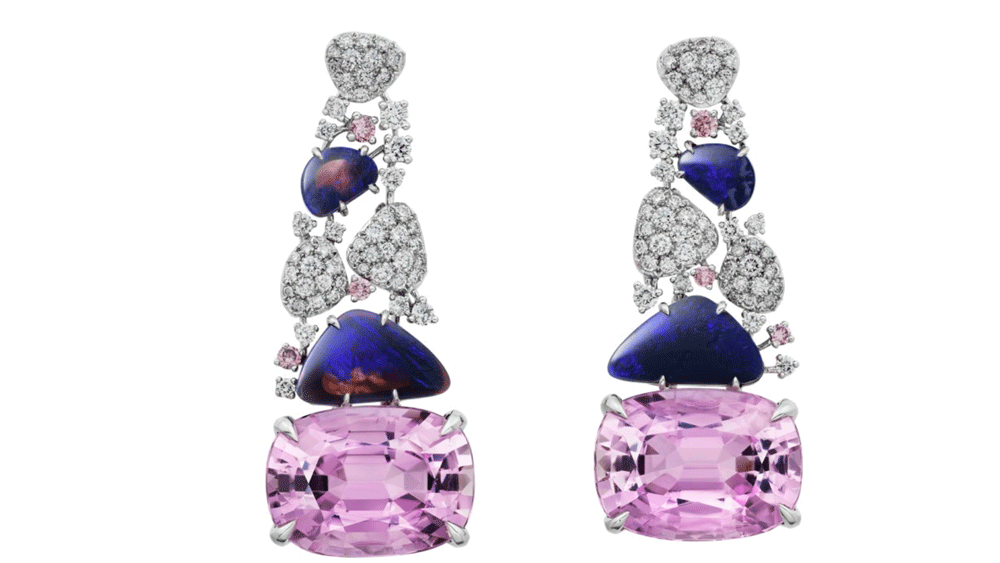 Cartier’s [Sur] Naturel high-jewellery collection brings a supernatural approach to designs inspired by the natural world. The Hemis suite reinterprets the house’s most enduring motif: the panther. These abstract earrings use opals and pavé diamonds and touches of pink diamonds set in platinum to represent the sleek cat’s spots. Two stunning pink kunzites, weighing nearly 30 carats, complete the design.