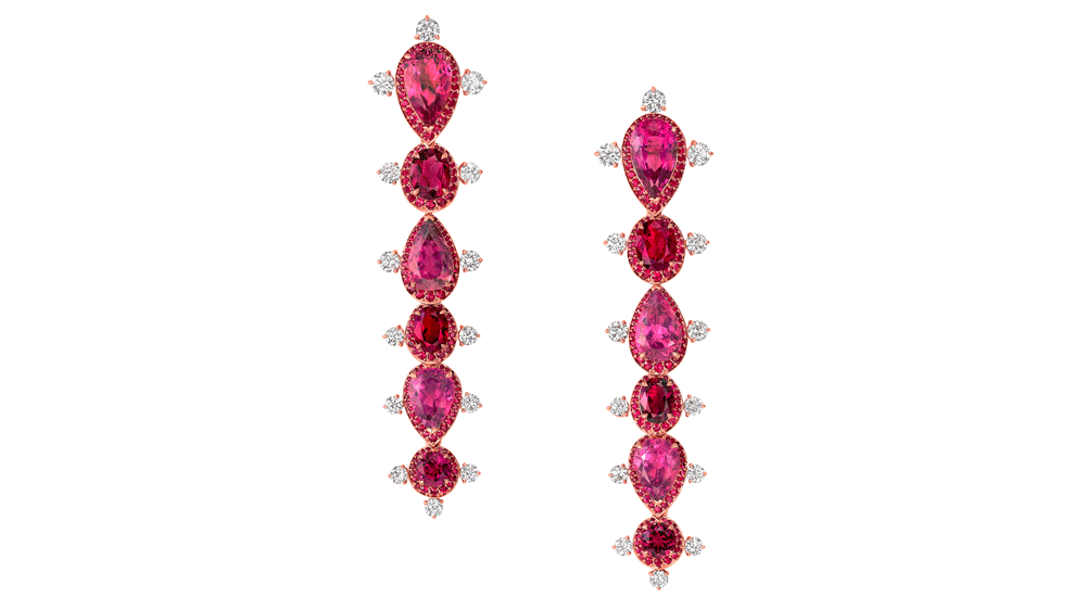 London-based fine jewellery designer Vania Leles launched her brand, Vanleles, to tell the story of Africa through ethically sourced and responsibly mined jewellery. A gemologist who has worked for houses including Graff and De Beers, she brings impeccable taste and craftsmanship to her pieces. The Out of Africa collection focuses on responsibly sourced ruby and rubellite from Mozambique, and these 18-karat rose gold Stiletto earrings alternate the complementary stones in 10.24 carats of rubies and 19.10 carats of rubellite, which accentuates their similar but distinct pink and red hues. Adding diamonds to the side of each stone adds an extra touch of sparkle.