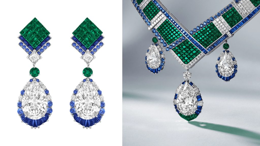 Purchased in 2018 for US$40 million through diamond dealer Jean-Jacques Taché, the Legend is the fifth-largest gem-quality diamond ever mined. The resulting finished stones range in size from 25.06 to 79.35 carats; in total, 67 diamonds came from the original rough. In Chapter I (of II) of the Legends of Diamonds collection, 25 jewellery pieces are created from the most important stones surrounded by rubies, sapphires and emeralds, the colors of which amplify the significance of the flawless and internally flawless white diamonds. The undeniable star is the Chevron Mystérieux necklace (pictured above), adorned with three massive pear-cut white diamonds—measuring 31.24 carats, 12.18 carats and 12.07 carats—dangling beneath an array of intense green emeralds and deep-blue sapphires.