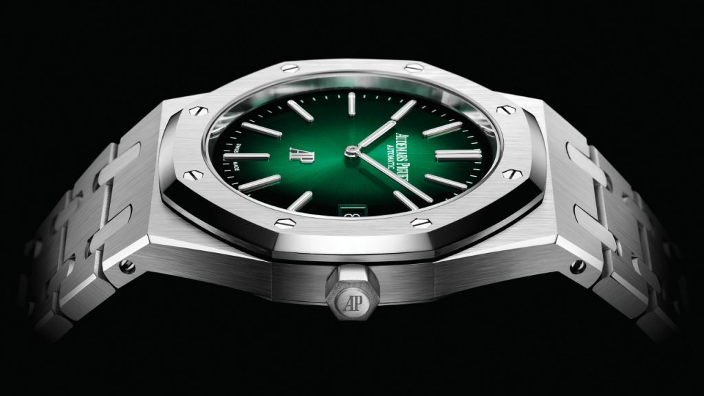 The Royal Oak “Jumbo” Extra-Thin features a 39 mm case and bracelet made from 950 platinum, topped with a glare-proofed sapphire crystal. Its green sunburst dial is accented with white gold applied hour markers, a date window and signature Royal Oak hands with luminescent coating. The timepiece also features a transparent sapphire caseback that gives collectors a view of its 22-carat gold oscillating weight. This detail is a part of the manufacturer’s self-winding Calibre 2121, which was introduced when the Royal Oak debuted in 1972.