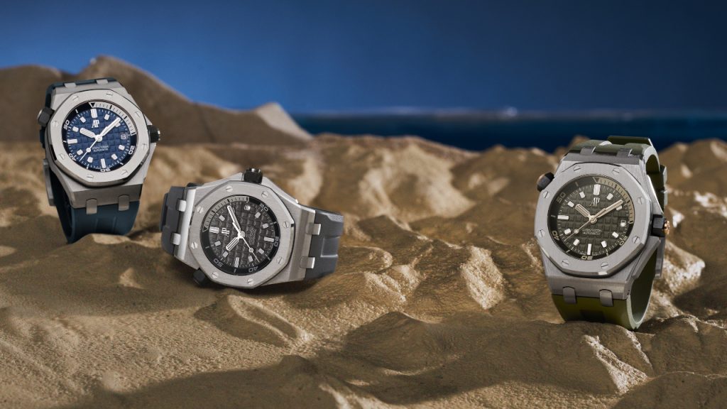 The dial retains the ‘Mega Tapisserie’ pattern, while the hands and markers have been redesigned with a truncated, broader profile. The hour hand in particular will be a calling card for this watch — its stout surface has three lengthwise stripes of luminescent coating. At 12 o’clock, the full signature bearing ‘Audemars Piguet’ is updated with the larger applied gold ‘AP’ logo. Otherwise, the watch remains 42mm in diameter and of course remains a true diving instrument with a unidirectional internal bezel operated by the ceramic crown at 10 o’clock and a 300m water resistance. Each of the three colours — khaki, grey and blue — comes with a matching rubber strap, with an additional black or blue one also provided, so the interchangeable strap system (which actually debuted with this release) can be tried out immediately.