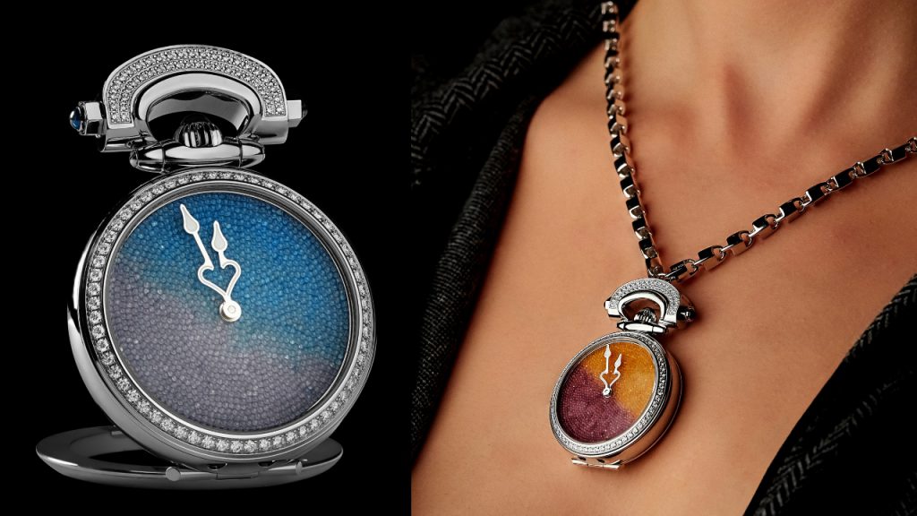 To further sweeten the deal, the new Miss Audrey Sweet Art watch, the first watch to use this dial decoration technique, can be used three ways: as a wristwatch, a pendant watch or a desk clock, without the use of a tool to change it. The crown on its Fleurier Amadéo convertible case is placed at 12 o’clock in order to facilitate this transformation and make it wearable in all formats. The pendant comes with a chain made of rhodium-plated silver. The hands, another signature Bovet touch, are shaped so that when they come together, they form a heart.