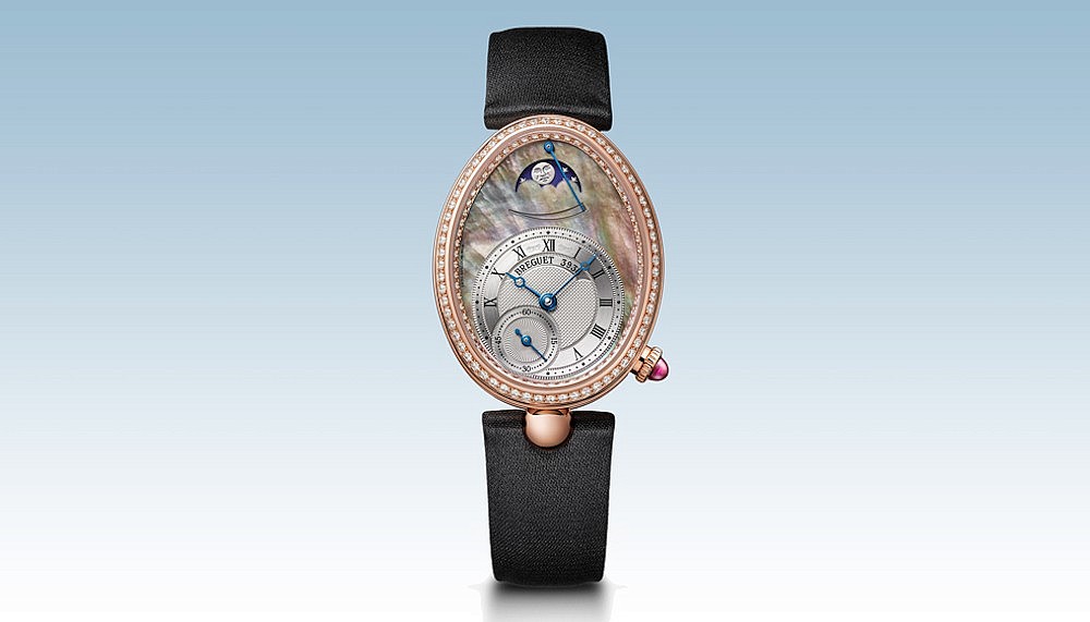 Worn with a black satin strap with a diamond-set folding clasp, the Reine de Naples 8908 is also available on a rose-gold bracelet.