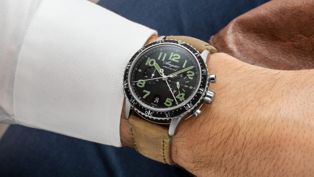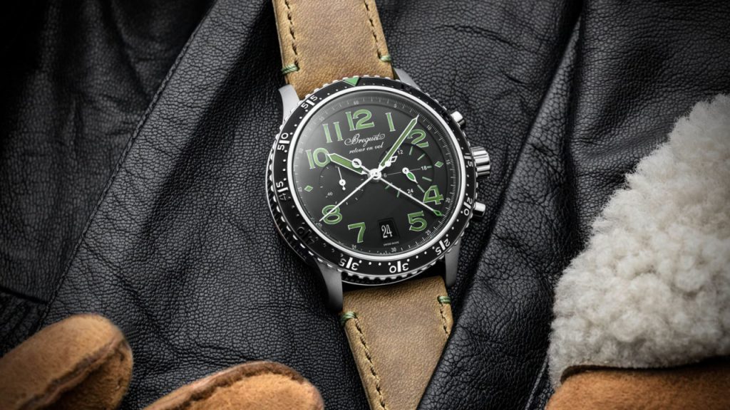 Breguet is be better known for its classic complications and purist, precious metal dress models. However, the Type XXI 3815 chronograph is pure Breguet. Louis Charles Breguet, a great-great-grandson of founder Abraham-Louis Breguet, was a pioneer of French aviation. He developed the gyroplane, the forerunner of the helicopter, along with a number of biplanes, seaplanes, fighter jets and civilian transport aircraft. The Breguet watch manufacture made aviation timepieces not only for his company, Breguet Aviation, but also for the American Air Force. In 1935, it started making wrist-worn chronographs, and in the 1950s, supplied the French Armed Forces with aviation watches. One of these early models, the Type XX chronograph, is the forerunner of the XXI. The “type” was not a model produced by any one company at the time, but rather, a military procurement specification from the French government that required its aviation watches to have a flyback chronograph function. Breguet was one of the main suppliers.