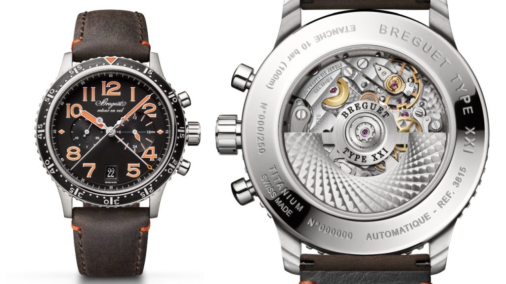 The Breguet Type XXI 3815 (RM58,800) is a numbered limited edition of 250 pieces in each of the two colours. The 42mm case is polished and satin-finished titanium, and the bidirectional bezel is black lacquered.