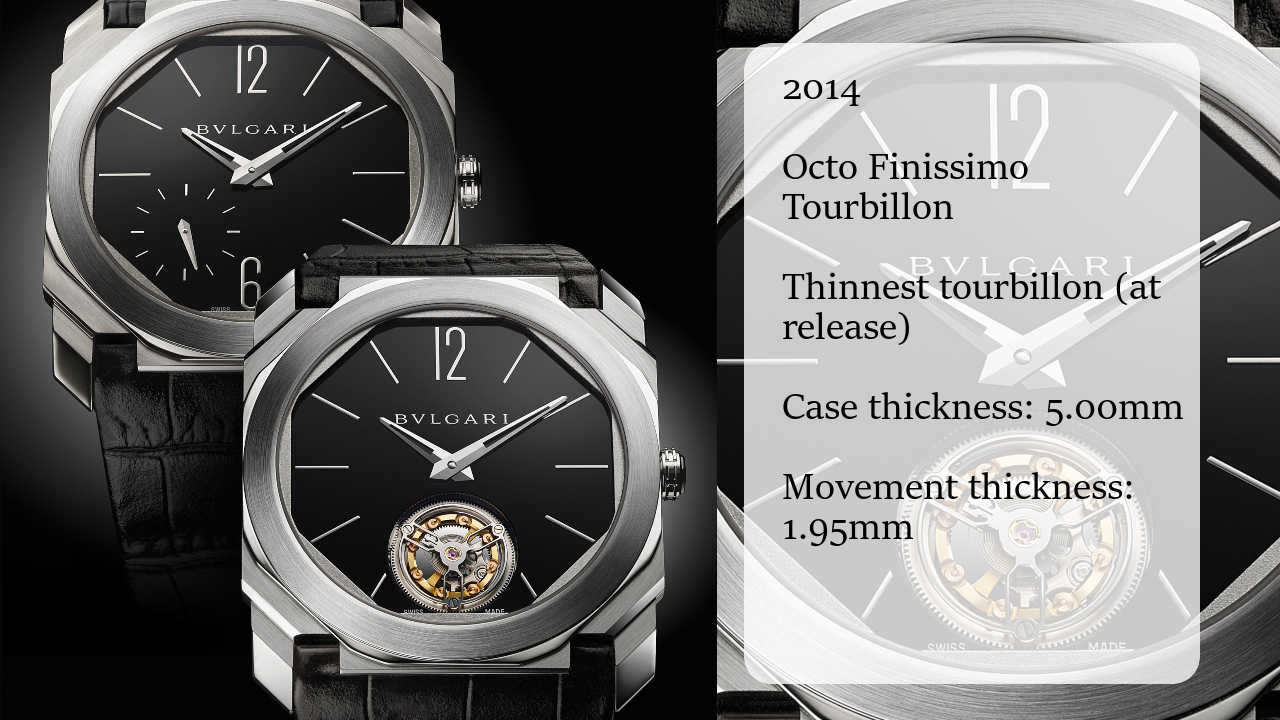 In 2018, Bulgari made its most ambitious release in the Octo Finissimo Tourbillon Automatic, which broke three records at once: thinnest automatic, thinnest tourbillon – these two previously held by past Octo Finissimo models – and thinnest automatic tourbillon.