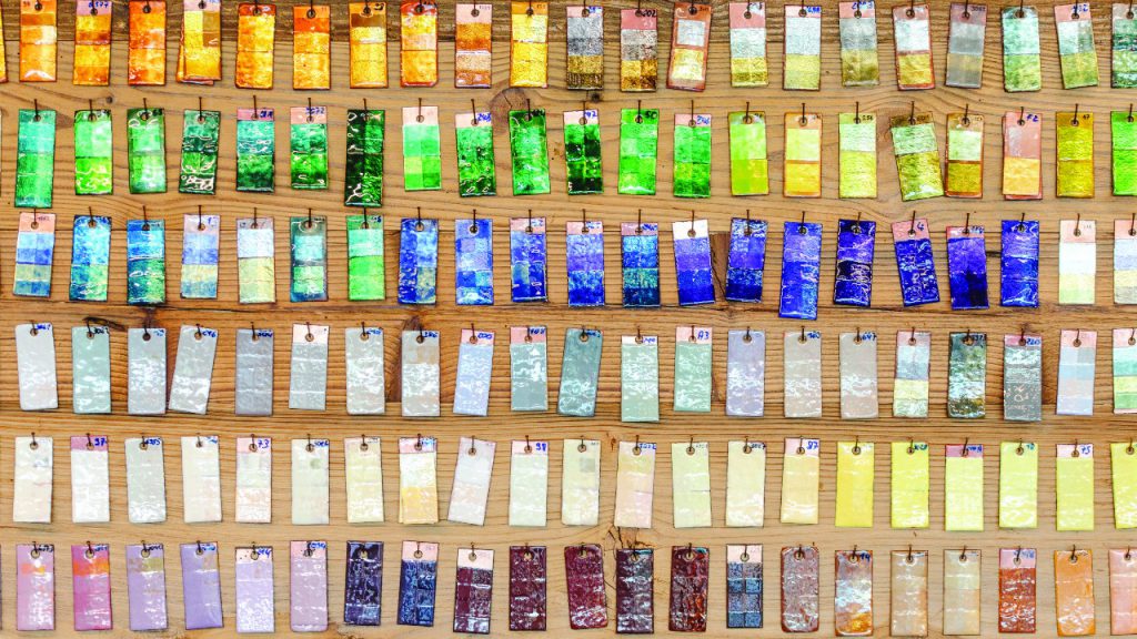 This wall highlights the many shades of enameling to show how the colours will look when they take shape on the dial.