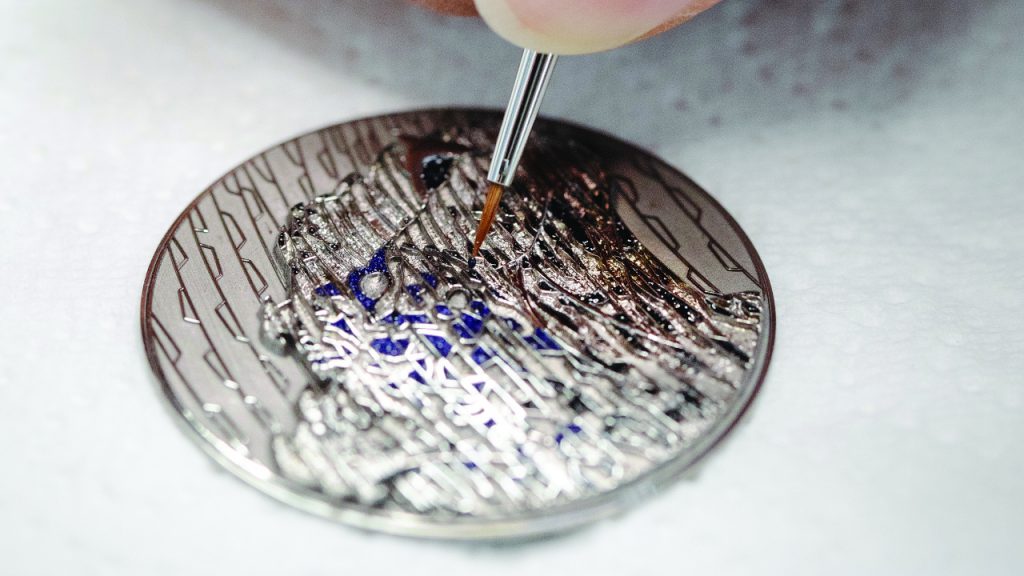 Tiny paintbrushes, the size of a handful of hair strands, are used to paint the enamel of the dial.