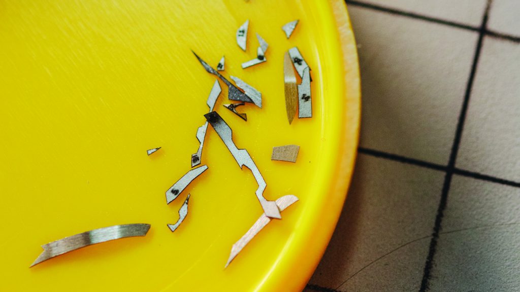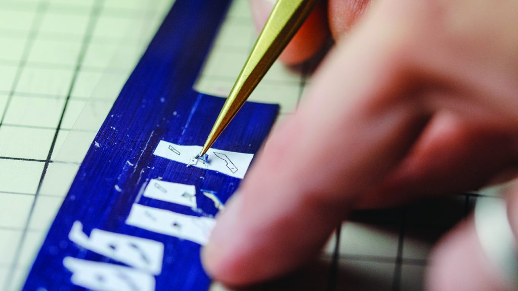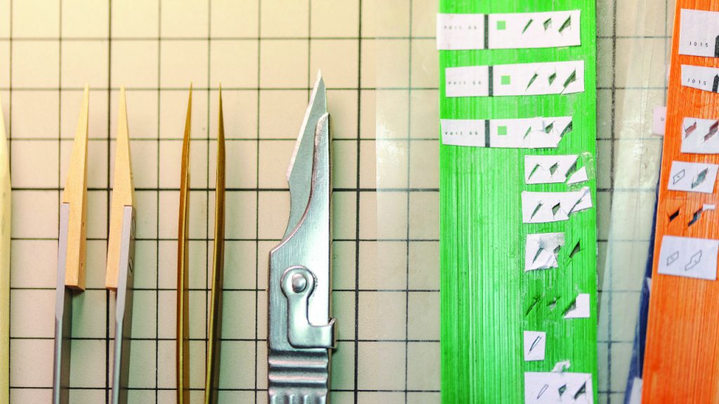 Various instruments, including tweezers and a scalpel, are used to trim and place the minute different pieces of coloured straw onto the dial.